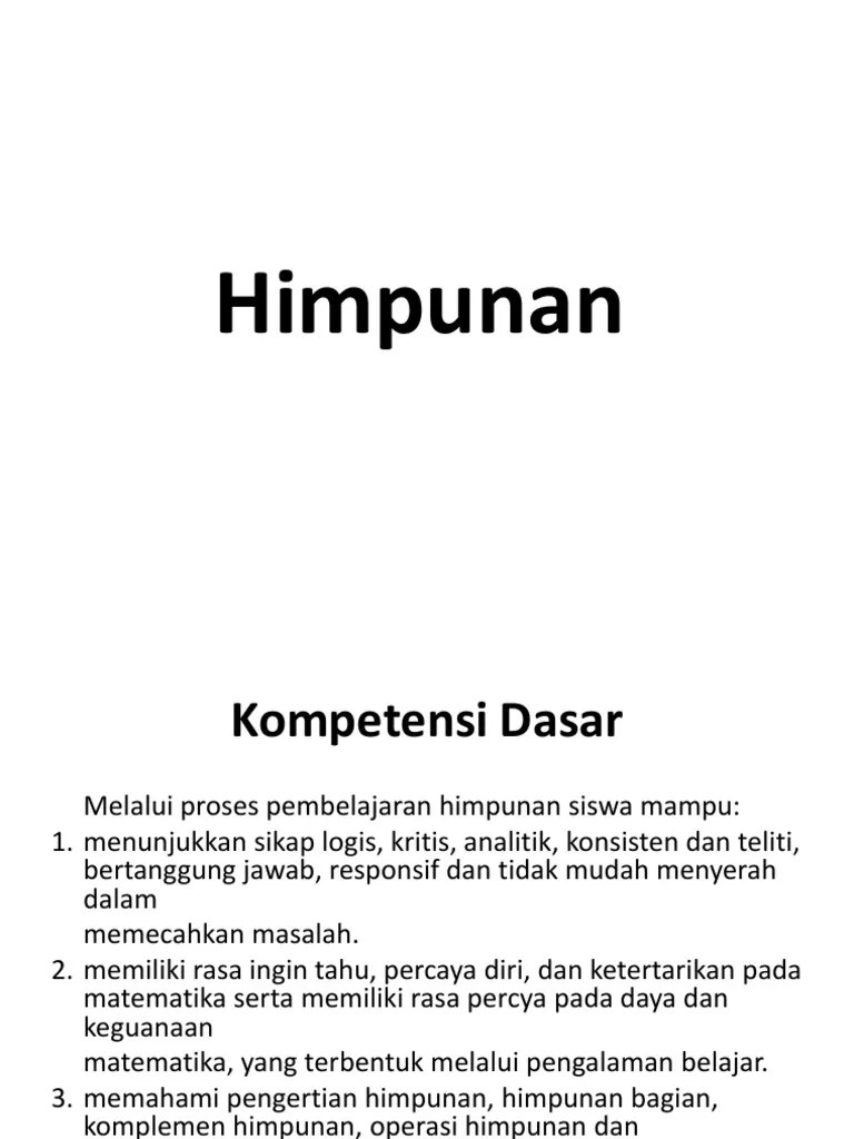 Pembahasan lengkap seputar materi himpunan smp kelas 7. Modul ini berisi rangkuman materi mengenai himpunan untuk siswa smp kelas vii. Berikut 25 soal himpunan matematika kelas 7 smp/mts. Soal dilengkapi kunci jawaban dan pembahasan mendetail. Ppt ini dilengkapi dengan video.